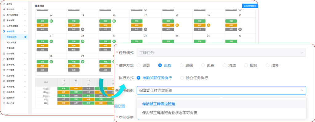 巡检巡更、设备检查等任务仅分配给当班人员,避免跨班指派与执行遗漏。