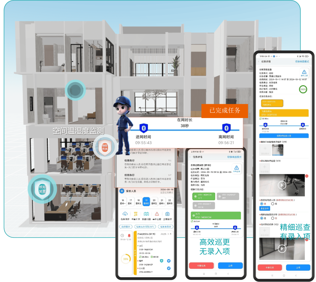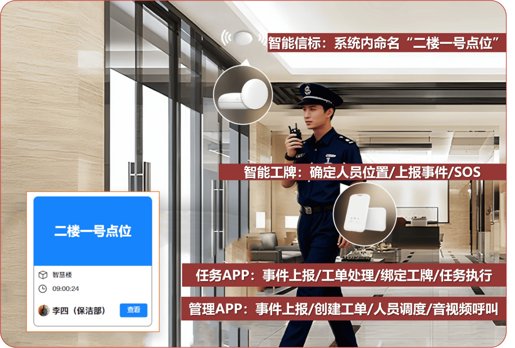 安防、保洁、工程维修人员统一使用同一定位与管理体系,无需多套系统并行。