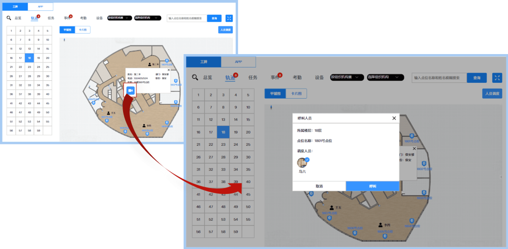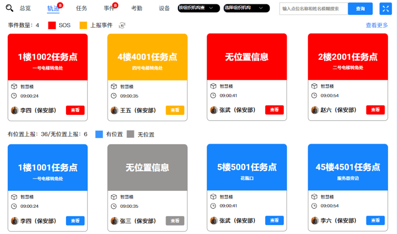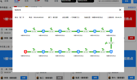 管理端实时展示各楼层安防人员分布情况,快速掌握空岗与高风险区域。