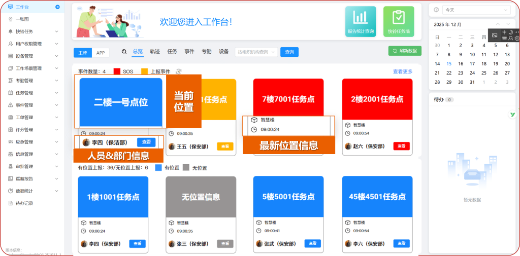 基于实时定位能力,系统进一步构建完整的安防人员调度系统。
