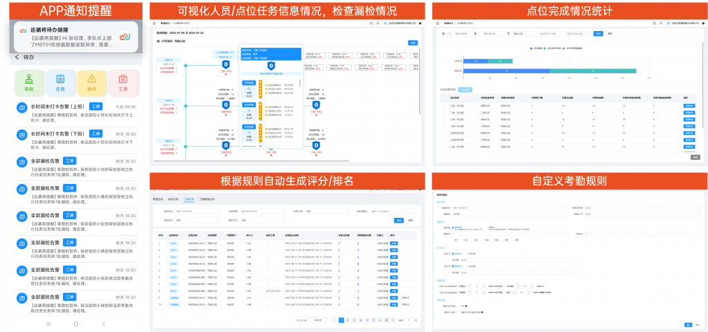绩效评分:可为任务、考勤和事件分别设定分值,并根据不同配置进行扣分。任务可按漏检和未达标情况扣分;考勤可针对迟到、早退、缺勤和旷工单独设置扣分;事件可根据长时间未打卡或停留情况进行扣分。