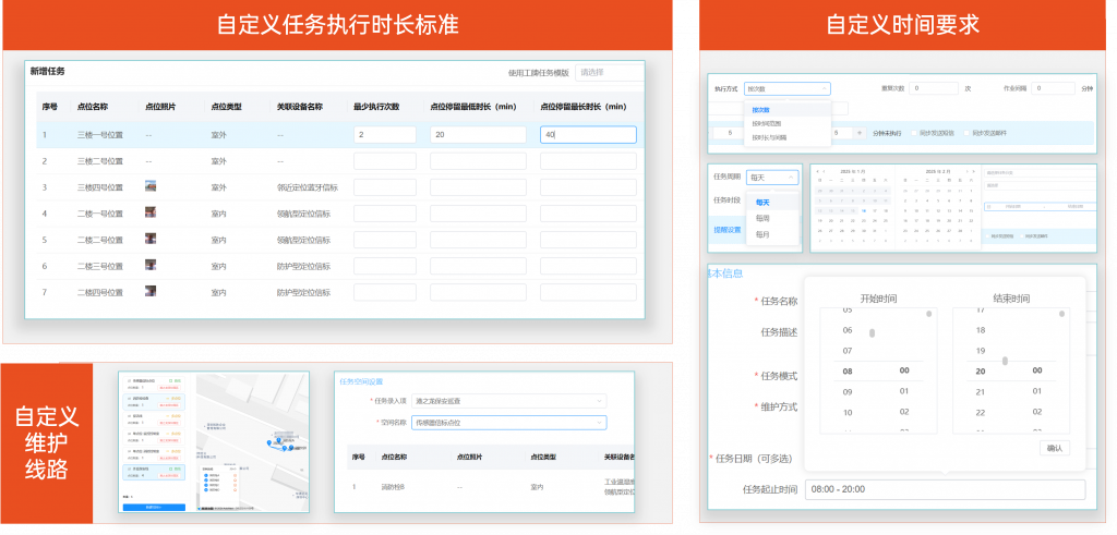 平台支持设置维护人员、维护点位组合、时间节点、执行频次、执行周期(如保安每2小时巡逻1次,每个点位标准时间),任务自动生成并推送至对应工牌,实现五定原则。
