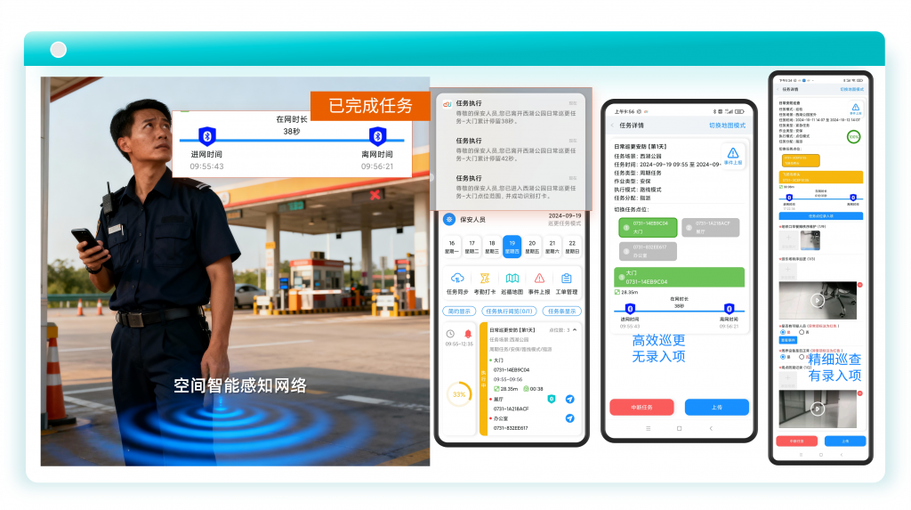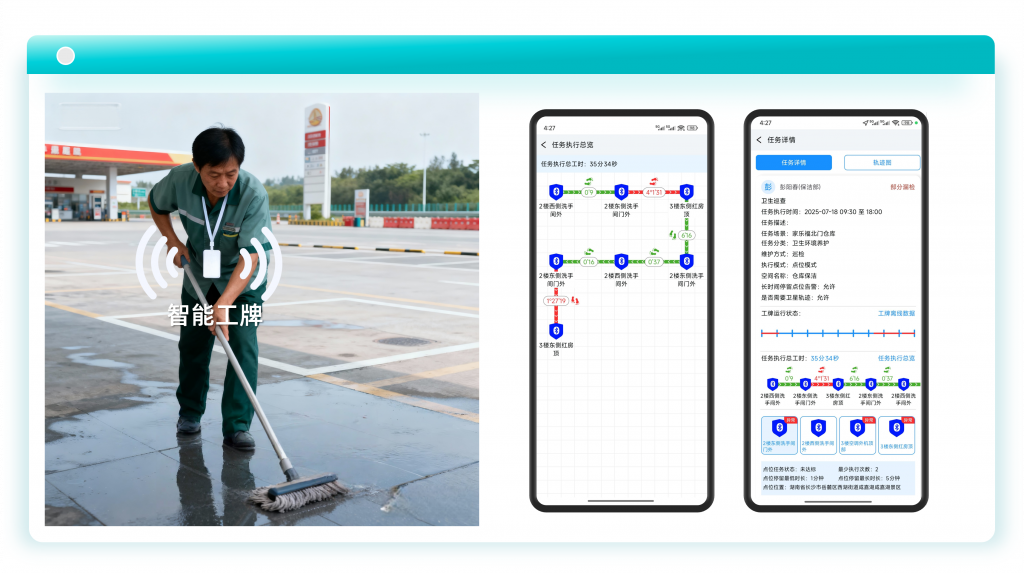 智能工牌专为高频次、多工种、复杂环境的现场作业场景设计(覆盖安防巡更、保洁养护、设备巡检、物业巡查、仓储管理等全场景),能够实时记录保安、保洁的移动轨迹及停留时长。管理人员可以直接通过云平台实时查看人员位置及运动状态,确保其按规定路线执行巡检、清洁等任务,方便管理人员对其进行考核和分析。