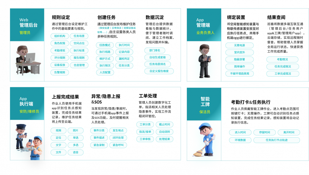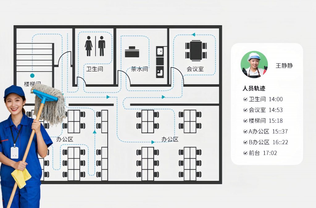 智能工牌专为高频次、多工种、复杂环境的现场作业场景设计(覆盖安防巡更、保洁养护、设备巡检、物业巡查、仓储管理等全场景),能够实时记录保安、保洁的移动轨迹及停留时长。管理人员可以直接通过云平台实时查看人员位置及运动状态,确保其按规定路线执行巡检、清洁等任务,方便管理人员对其进行考核和分析。