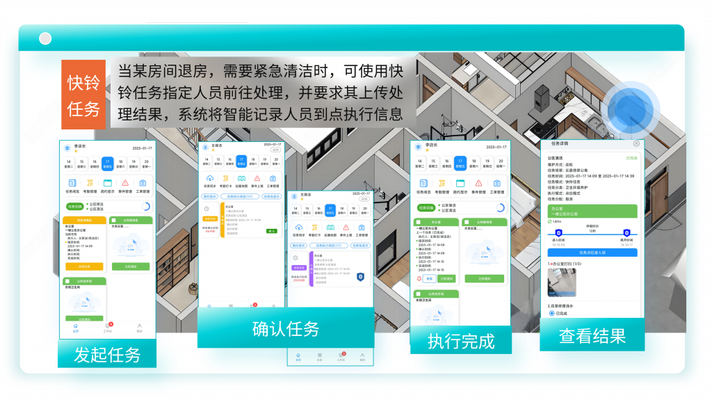 系统内置【周期】、【临时】、【紧急】、【排班】、【快铃】、【工牌】任务模式,适用于房间清洁、布草更换、设备检查、泳池水质记录、大堂巡查等酒店日常服务场景。