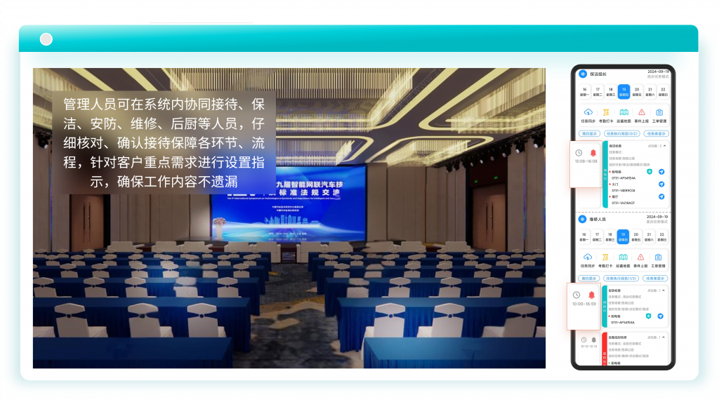 系统的 Web 与 App 多端互通能力,可帮助酒店管理者远程查看客房清洁、设施检查、工程工单等数据,及时掌握运营质量与问题处理进度。