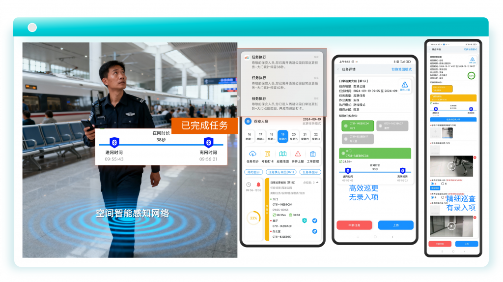 系统支持【周期】、【临时】、【紧急】、【排班】、【快铃】、【工牌】任务模式,可满足站区秩序巡查、卫生维护、扶梯点检、广播设备检查、旅客服务点巡查等多类型任务。