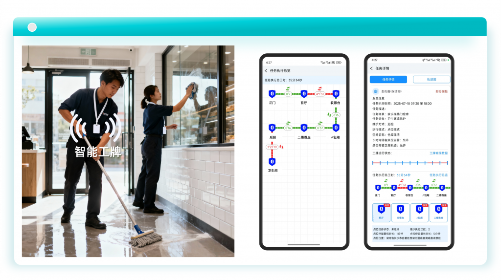 系统自动记录店员、保洁、巡店人员的工作轨迹、执行时长及异常情况,包含【考勤信息】与【执行过程】,数据加密不可篡改,使门店运营动作可量化、可核查。