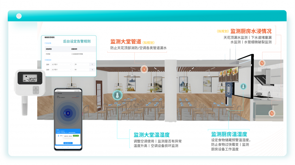 可在仓库、冷链设备区、后场加工区、配电间等位置部署温湿度传感器,自动采集环境数据,保障食品与商品存储的安全性。