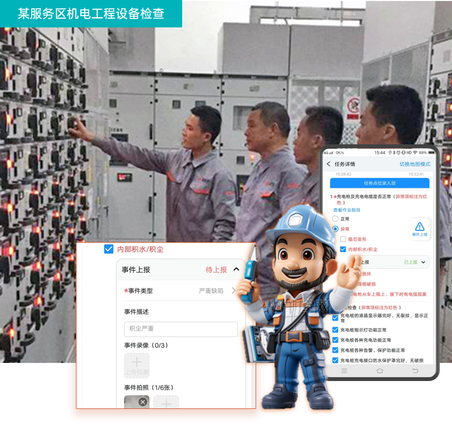 针对照明、供水、空调、充电桩、机电设备等设施,巡循将支持设备点位绑定与周期性巡检任务设置,要求维护人员按规定线路到点检查并上传结果。设备巡检与维护记录全程留痕,形成完整台账,帮助服务区实现设备设施的长期稳定运行。