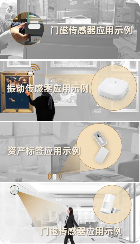 振动传感器:贴于文物底座或外框,监测振动状态资产标签应用示一旦超过振动阈值立即告警。