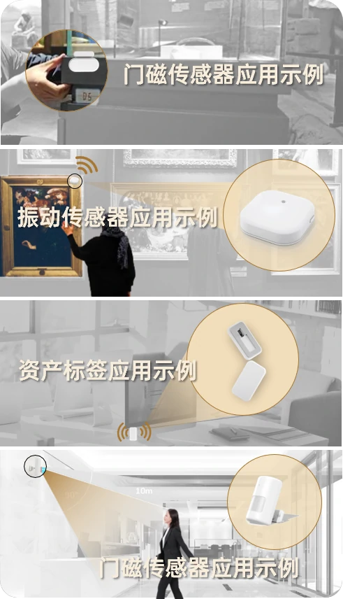 门磁传感器:贴于展柜门 处,记录开关时间与频次实时提醒异常开启。