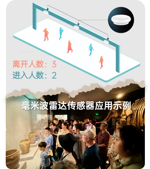 毫米波雷达拥有人体存在性检测、人流量统计、人数清点等功能,其先进算法能够区分儿童、成人和宠物,辅助管理人员掌握馆内人流量状态,优化运营和管理策略,预防踩踏事故发生。